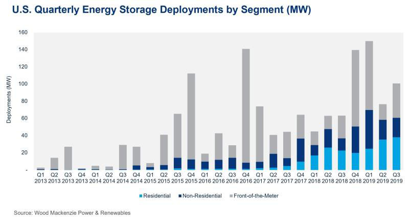 住宅電池儲(chǔ)能系統(tǒng)的這種增長(zhǎng)早在太平洋天然氣和電力公司為了防火而采取停電措施之前就已經(jīng)發(fā)生。而在加利福尼亞州分別在10月和11月發(fā)生的斷電事件使數(shù)百萬(wàn)人斷電數(shù)小時(shí)或數(shù)天的時(shí)間。其停電事件是最近才發(fā)生的,并不是美國(guó)儲(chǔ)能市場(chǎng)第三季度增長(zhǎng)的主要原因。