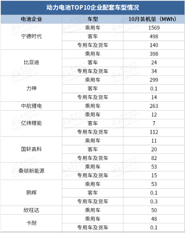 在10月動力電池裝機(jī)量TOP 10企業(yè)中,老牌動力電池企業(yè)力神沖到第三。隨著配套企業(yè)東風(fēng)本田、廣汽本田旗下車型的大幅上量,力神電池裝機(jī)量也水漲船高,10月以312.51MWh的裝機(jī)量挺進(jìn)第三位;桑頓新能源憑借著對一汽奔騰車型的配套放量,10月裝機(jī)量達(dá)到67MWh,躋身TOP 10企業(yè)第七位;卡耐10月裝機(jī)量48MWh,剛好位居第十,主要配套企業(yè)有江鈴新能源、上汽通用五菱。
