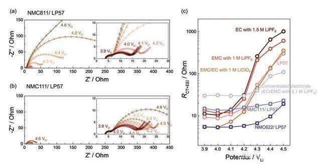 從下圖c可以看到NCM111、Al2O3包覆NCM622和采用高濃度電解液的NCM811材料在充電到4.8V的過程僅出現(xiàn)了輕微的電荷交換阻抗增加現(xiàn)象,