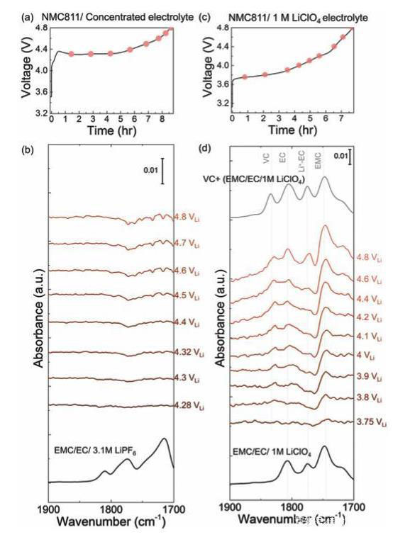 近日,麻省理工的Yirui Zhang(第一作者、通訊作者)和Yang Shao-Horn(通訊作者)等人開發(fā)了一種原位的紅外吸收的方法對碳酸酯類電解液在NCM正極表面發(fā)生分解的過程進行了分析。研究表明,盡管EC在Pt電極的表面的抗氧化電位可達4.8V,但是在NCM811表面時3.8V以上就開始發(fā)生氧化分解。