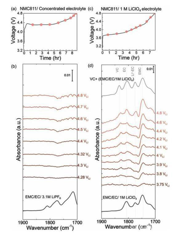 而在以LiClO4作為鋰鹽的電解液中,由于LiClO4的解離度比較低,因此相比于同等濃度下的LiPF6電解液,能夠參與到Li+溶劑化中的EC分子更少,因此我們在LiClO4作為鋰鹽的電解液中觀察到了類似的EC在正極表面分解的現(xiàn)象。