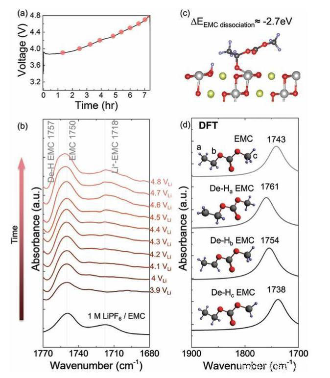 如果電解液中不存在EC,EMC是否也會在正極表面發(fā)生分解?作者對1M LiPF6的EMC溶液進行了測試,隨著電壓的升高,我們能夠看到EMC也開始在正極表面發(fā)生分解(如下圖a所示)。在非原位紅外測試中我們能夠在1750和1718/cm處觀察到C=O鍵的吸收峰,對應(yīng)的為EMC和與Li+結(jié)合后的EMC。同樣的我們在Pt電極上,電壓達到4.8V也未觀察到EMC的分解,這與密度函數(shù)理論的計算結(jié)果是一致的。但是在NCM811材料的表面,1750/cm處的吸收峰隨著電壓的升高向著更高的波數(shù)偏移(如下圖b所示),表明EMC發(fā)生脫氫反應(yīng),作者認為這是一個b位的H被脫去,而形成一個C-O鍵。