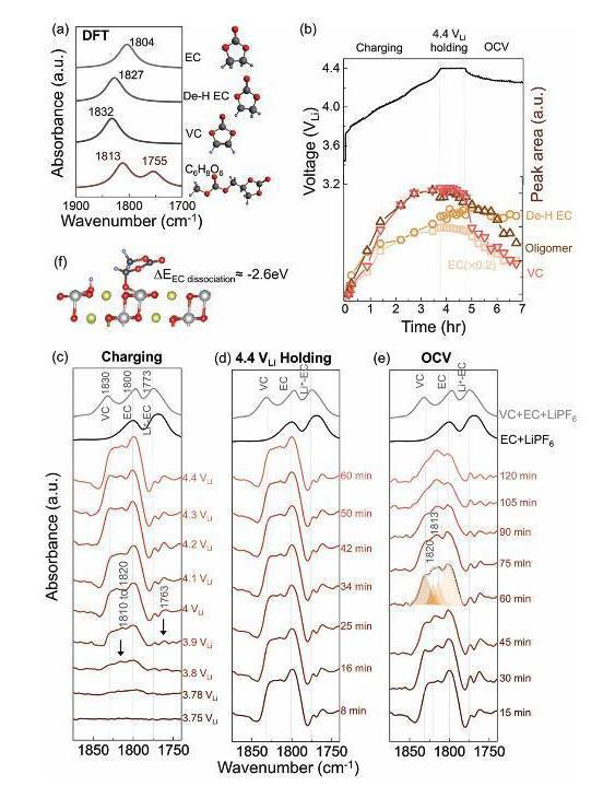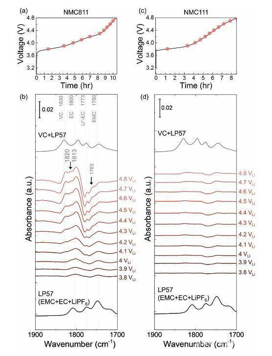 在下圖d所示的4.4V恒壓測試中,多數(shù)吸收峰隨著恒壓時間的增加而出現(xiàn)了一定程度的降低,在恒壓過程中VC(1830/cm)、低聚物(1820/cm)和EC(1800/cm)分子的強度都在降低,表明這些物質(zhì)能夠從NCM811的表面擴散到電解液之中,而脫一個H原子的EC(1813/cm)分子的吸收峰沒有出現(xiàn)明顯的變化,表明該分子通過C-O鍵固定在NCM811材料的表面。