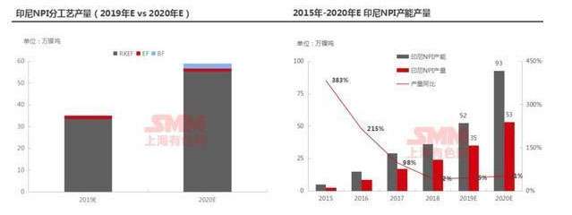 2019年中國(guó)NPI產(chǎn)量增長(zhǎng)至58萬(wàn)鎳噸,高利潤(rùn)及環(huán)保影響的消退,疊加新增產(chǎn)能釋放的增量,同比增速達(dá)28%。2020年,印尼禁礦生效之后,中國(guó)NPI陷入原料短缺的困境,以全年所能供應(yīng)的紅土鎳礦數(shù)量預(yù)計(jì),中國(guó)NPI產(chǎn)量大幅下滑至51萬(wàn)鎳噸。印尼禁止鎳礦出口后中國(guó)NPI產(chǎn)量轉(zhuǎn)為負(fù)增長(zhǎng)。