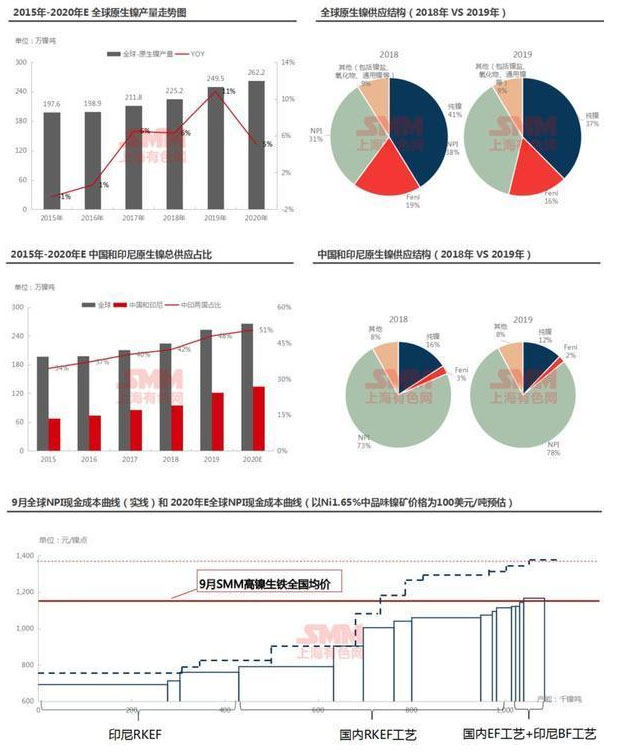 從全球原生鎳的供應(yīng)格局來(lái)看,2019年全球原生鎳產(chǎn)量為249萬(wàn)鎳噸,同比增11%,增量來(lái)自中國(guó)和印尼的NPI。預(yù)計(jì)2020年全球原生鎳產(chǎn)量增長(zhǎng)至262萬(wàn)鎳噸,受中國(guó)NPI大幅減產(chǎn)影響,產(chǎn)量增速下滑。全球原生鎳供應(yīng)結(jié)構(gòu)中,二級(jí)鎳在NPI的帶動(dòng)下占比繼續(xù)上升,一級(jí)鎳占比下降。中國(guó)和印尼兩國(guó)原生鎳供應(yīng)將占全球供應(yīng)的50%,主要為NPI。預(yù)計(jì)2020年鎳礦漲價(jià)將導(dǎo)致國(guó)內(nèi)NPI生產(chǎn)成本超過1300元/鎳點(diǎn)。