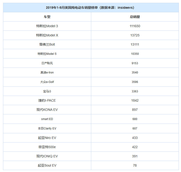 根據(jù)insideevs統(tǒng)計(jì)的數(shù)據(jù),美國在今年1月-9月的純電動車銷量總和為17.38萬輛,其中特斯拉車型的總銷量13.57萬輛,占比達(dá)到驚人的78%。而反觀剩下的22%那部分銷量,共涵蓋了16款車型,其中僅有一款車型由美國車企生產(chǎn),那就是來自通用的雪佛蘭Bolt。