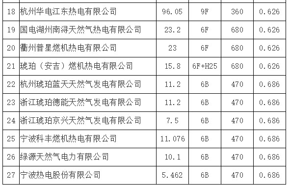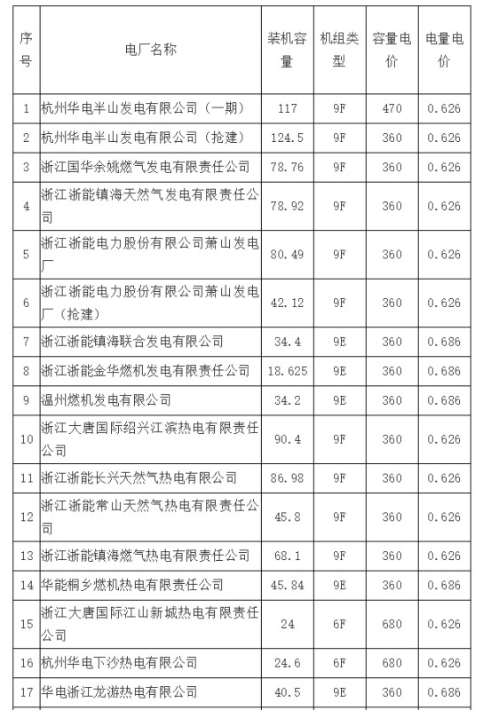 浙江省天然氣發(fā)電企業(yè)上網(wǎng)電價(jià)表