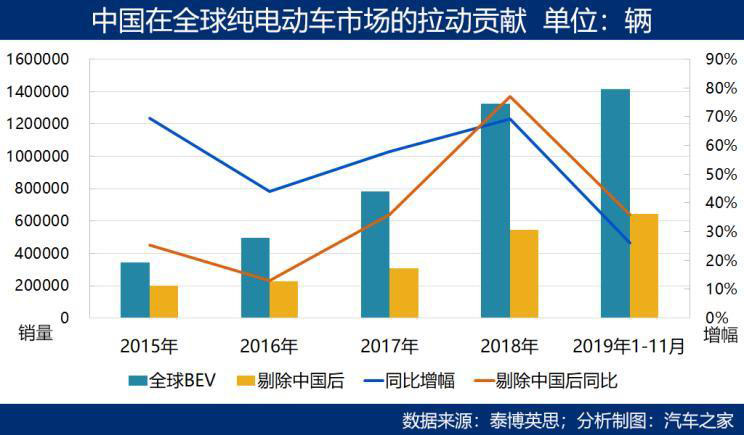 今年前十一個(gè)月,全球純電動(dòng)汽車?yán)塾?jì)銷量的同比增幅是26%,剔除中國市場以后,同比增幅增加為36%。2019年是中國電動(dòng)汽車補(bǔ)貼退出幅度最大的一年,本地市場因此在下半年出現(xiàn)了五連跌,沒有高額補(bǔ)貼護(hù)體的中國電動(dòng)車,放慢了腳步。