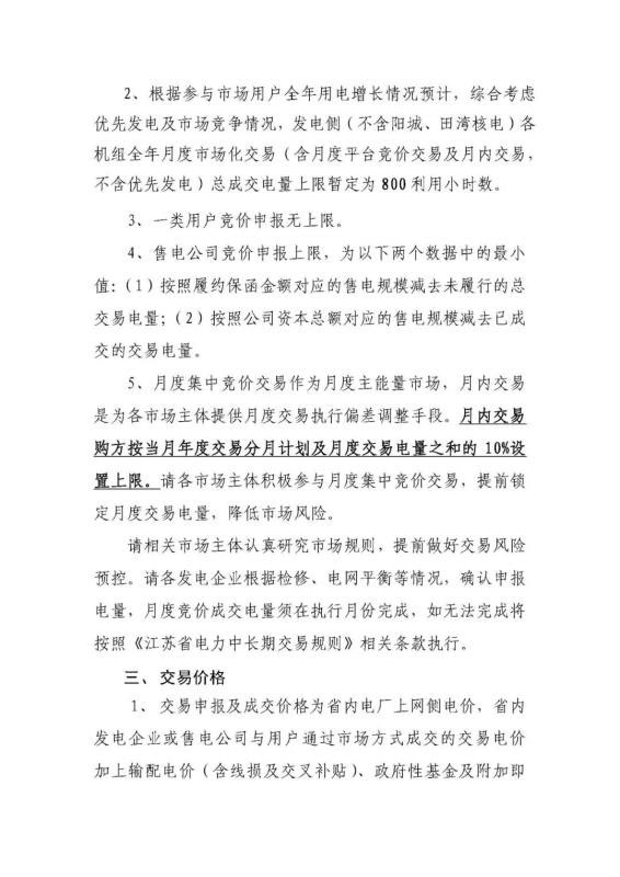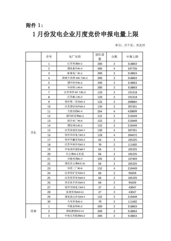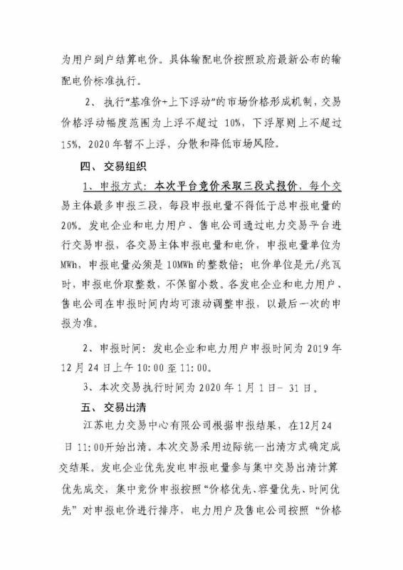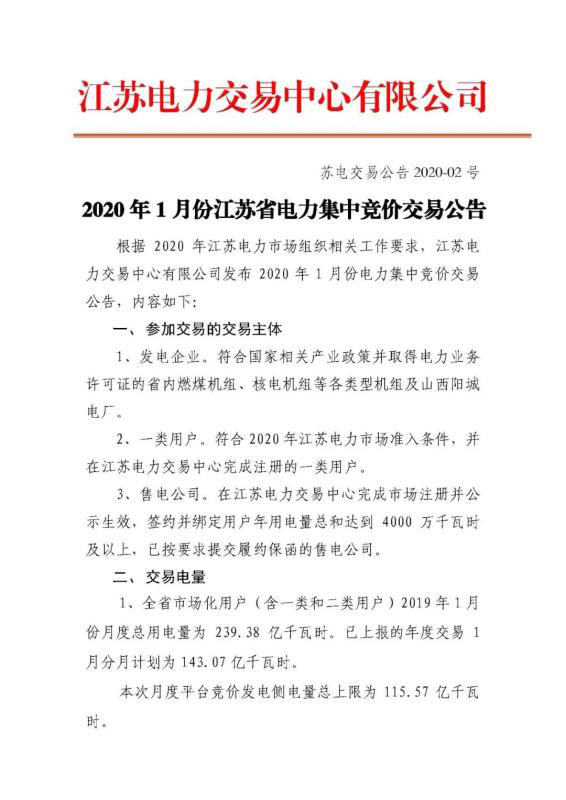 2020年1月份江蘇省電力集中競價(jià)交易公告