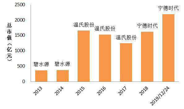 據(jù)《深圳證券交易所市場(chǎng)統(tǒng)計(jì)年鑒2018》顯示,2018年創(chuàng)業(yè)板的總市值第一名就是寧德時(shí)代,以1620億元奪得了創(chuàng)業(yè)板的總市值魁首。而在此之前,創(chuàng)業(yè)板的魁首由碧水源(300070,SZ)和溫氏股份(300498,SZ)把持多年。