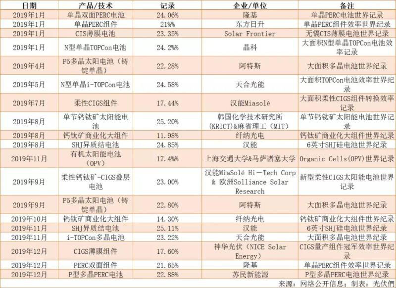 2019年電池組件效率記錄一覽