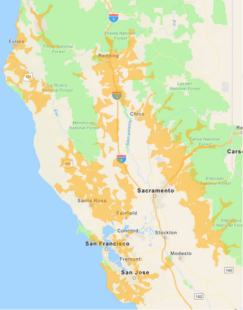 根據(jù)太平洋天然氣和電力公司(PG&E)提供的地圖信息,卡利斯托加市將會受到森林火災(zāi)的影響。