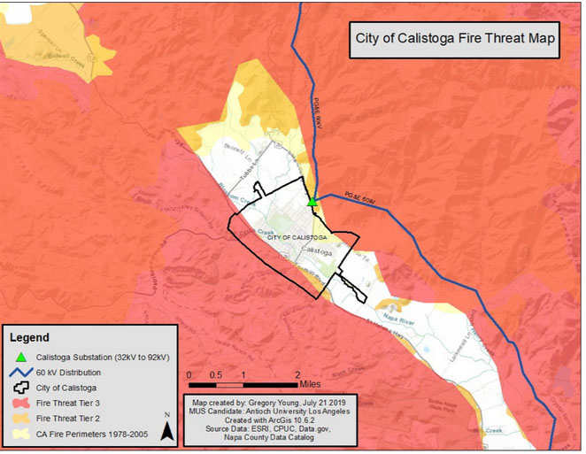 加利福尼亞州有一些地區(qū)已經(jīng)為電力中斷做準(zhǔn)備。例如,加利福尼亞州卡利斯托加市已要求清潔聯(lián)盟進(jìn)行可行性分析,以開發(fā)社區(qū)微電網(wǎng),并作為管理和應(yīng)用加利福尼亞在火災(zāi)高發(fā)季度停電(PSPS)的一種潛在工具。下圖是太平洋天然氣和電力公司(PG&E)發(fā)布的城市火災(zāi)威脅圖,并指出接到城市的60kV電力線具有被森林火災(zāi)影響的風(fēng)險。