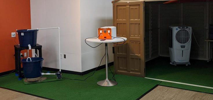 如上圖所示,放在桌子上是這款產(chǎn)品,桌子左側(cè)是水泵,右側(cè)房間是“廉價(jià)冷卻裝置”(家用冷風(fēng)機(jī))。產(chǎn)品正面有兩個(gè)白色的標(biāo)準(zhǔn)插頭。下圖顯示了這款產(chǎn)品的整體情況,并提供了內(nèi)部截面圖。該單元包括一個(gè)IQ8微型逆變器,專門用于在電力供應(yīng)不穩(wěn)定的市場(chǎng)。