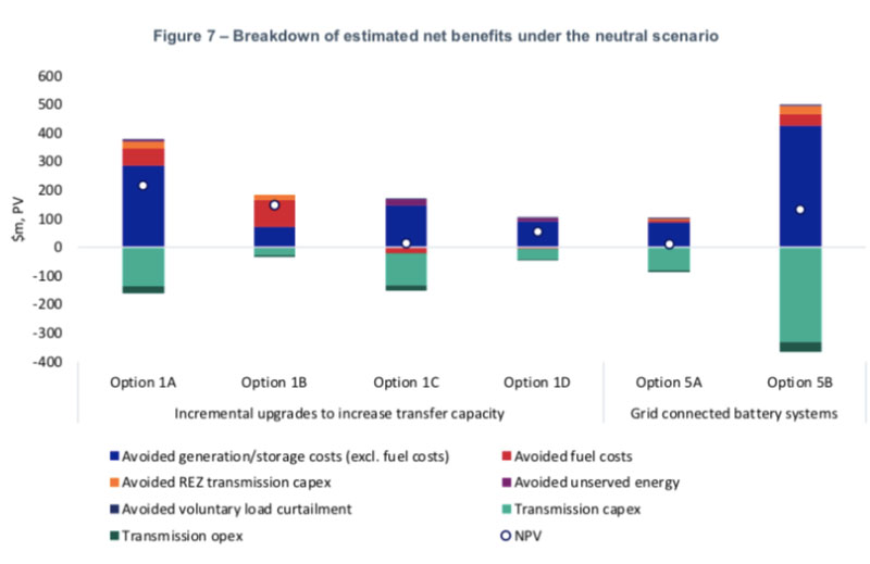 Transgrid公司在調(diào)查報(bào)告中指出,“雖然5B方案提供了最大的總收益,但在這種情況下,預(yù)計(jì)只能提供方案1A預(yù)期凈收益的60%。這是因?yàn)樵撨x擇方案具有較高的前期投資成本,并且電池儲(chǔ)能系統(tǒng)的資產(chǎn)壽命較短,因此需要在評估期內(nèi)進(jìn)行再投資。”