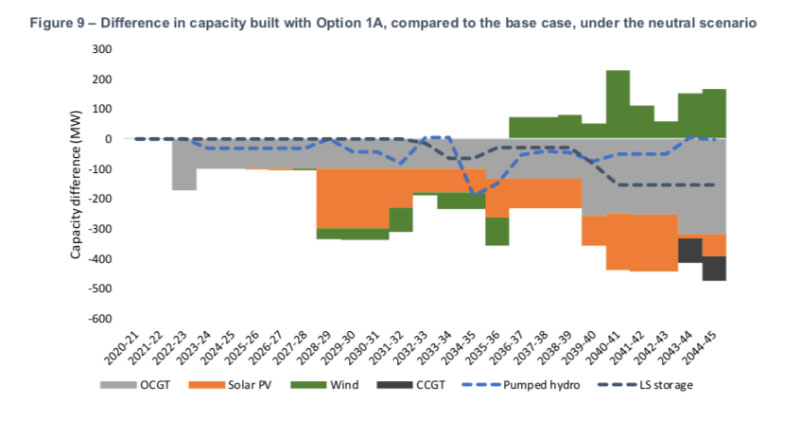 而對于某些人來說,首選的1A方案將是一個(gè)壞消息。首先,這將導(dǎo)致峰值天然氣發(fā)電廠(灰色的OCGT)所需的容量減少,而太陽能發(fā)電廠的容量(橙色)和兩個(gè)風(fēng)力發(fā)電場所需的發(fā)電量減少,盡管目前還沒有真正的洞察到這些驅(qū)動(dòng)因素,但長期來看將會(huì)部署更多的風(fēng)力發(fā)電設(shè)施。