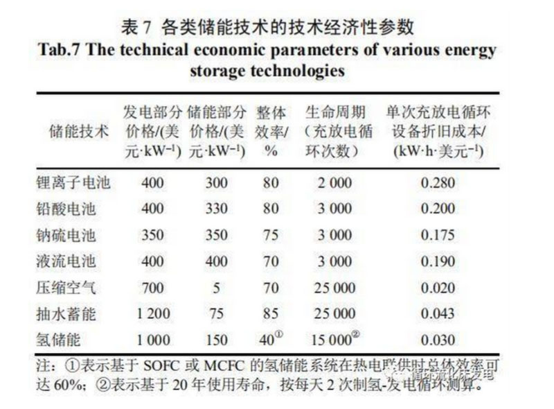 氫儲能相較于其他儲能方式的劣勢在于能源轉(zhuǎn)化效率低、成本高。美國Sandia國家實(shí)驗(yàn)室在2015年發(fā)布了關(guān)于儲能技術(shù)經(jīng)濟(jì)性分析的報(bào)告,總結(jié)了各種已商業(yè)化的儲能技術(shù)的價(jià)格、效率及使用壽命,見表7。目前常用電化學(xué)電池的效率為70%~80%,而氫儲能系統(tǒng)即便在考慮熱電聯(lián)供的條件下效率也僅有40%左右。