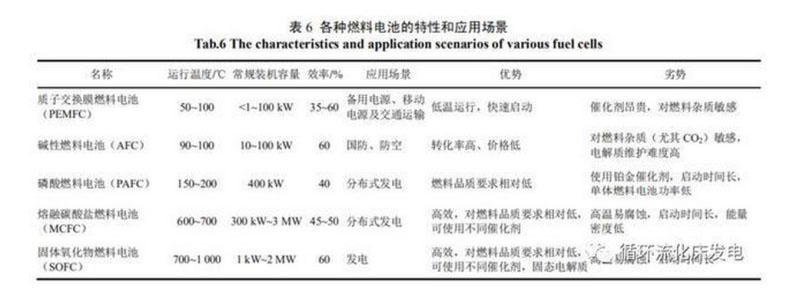 燃料電池能將氫的化學(xué)能直接轉(zhuǎn)化為電能,具有較高的能量轉(zhuǎn)換效率,因此燃料電池發(fā)電是未來氫能利用的主流技術(shù)。根據(jù)工作溫度和電解質(zhì)的不同,燃料電池分為中低溫條件下工作的質(zhì)子交換膜燃料電池(protonexchangemembranefuelcell,PEMFC)、堿性燃料電池(alkalinefuelcell,AFC)和磷酸燃料電池(phosphoricacidfuelcell,PAFC),此外還有在高溫工況下工作的熔融碳酸鹽燃料電池(moltencarbonatefuelcell,MCFC)和固體氧化物燃料電池(solidoxidefuelcell,SOFC)。據(jù)美國能源部發(fā)布的氫燃料電池技術(shù)比較,各種燃料電池的特性和應(yīng)用場景見表6。