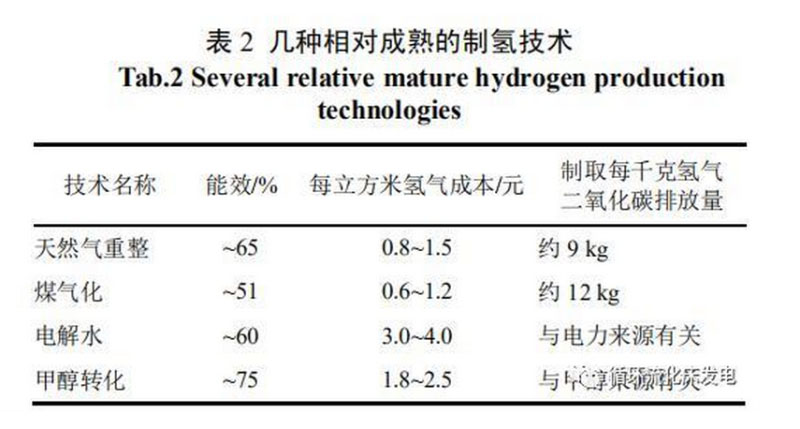 目前,主要以煤或天然氣等為原料來制取氫氣,來源于化石燃料的氫氣約占?xì)錃饪偖a(chǎn)量的95%。幾種相對成熟的制氫技術(shù)見表2。我國是世界上氫氣產(chǎn)量最大的國家之一,年產(chǎn)氫氣量約2000萬t,占世界氫總產(chǎn)量的1/3,并以煤氣化制氫為主。在煤炭價(jià)格為500元/t的情況下,煤制氫的成本約0.7元/m3。但是,此類技術(shù)需要結(jié)合CO2捕集和封存技術(shù)才能解決碳排放問題,因此不能作為氫能的長久來源。