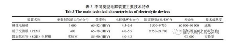 制氫裝置在國內(nèi)外均有商業(yè)化運(yùn)行。其中,PEM電解水制氫裝置成本較高,一般是堿性電解水裝置的3倍左右3種電解裝置的主要技術(shù)特點(diǎn)對比見表3。