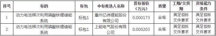 據(jù)此前報道,億緯鋰能曾中標(biāo)動力電池梯次利用磷酸鐵鋰儲能系統(tǒng),其投標(biāo)報價為1.73元/Wh,一起參與投標(biāo)的另一候選人為上海電氣,其投標(biāo)價格2.03元/Wh。