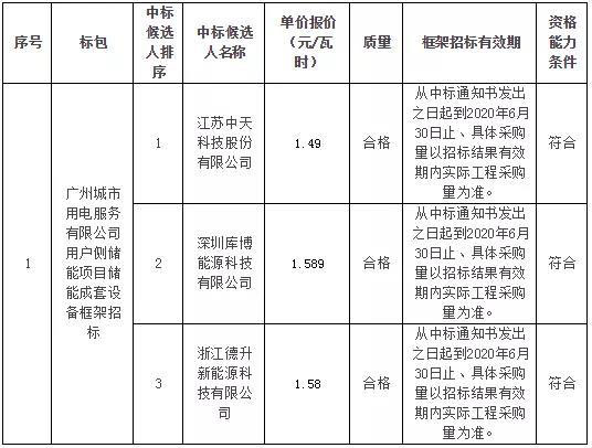 廣州城市用電公司2MW/4MWh用戶側(cè)儲能項(xiàng)目設(shè)備框架中標(biāo)結(jié)果中,江蘇中天科技股份有限公司為第一候選人,報價價格為1.49元/Wh,第二候選人為深圳庫博能源科技有限公司,其投標(biāo)價格為1.589/Wh,第三候選人為浙江德升新能源科技有限公司,投標(biāo)價格為1.58元/Wh。據(jù)了解,該招標(biāo)此前公示預(yù)計采購單價為1.59元/Wh。