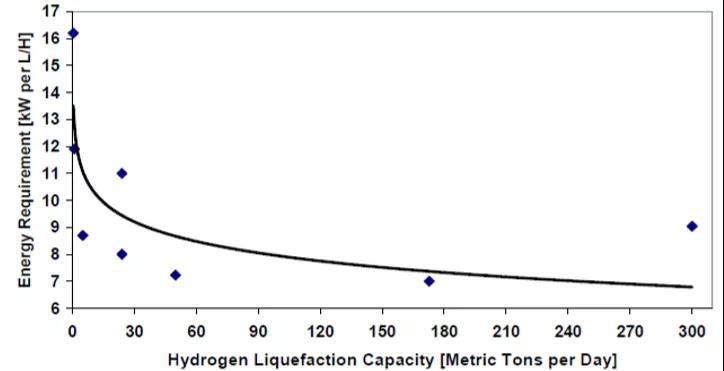 圖5 氫液化能耗隨氫液化規(guī)模變化圖(來(lái)源:林德)