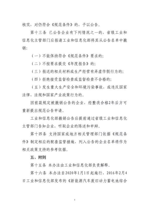 為適應(yīng)行業(yè)發(fā)展新形勢(shì),引導(dǎo)行業(yè)持續(xù)健康發(fā)展,現(xiàn)將《新能源汽車廢舊動(dòng)力蓄電池綜合利用行業(yè)規(guī)范條件(2019年本)》和《新能源汽車廢舊動(dòng)力蓄電池綜合利用行業(yè)規(guī)范公告管理暫行辦法(2019年本)》予以公告?!缎履茉雌噺U舊動(dòng)力蓄電池綜合利用行業(yè)規(guī)范條件》和《新能源汽車廢舊動(dòng)力蓄電池綜合利用行業(yè)規(guī)范公告管理暫行辦法》(工業(yè)和信息化部公告2016年第6號(hào))同時(shí)廢止。
