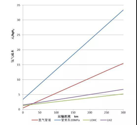 考慮運(yùn)輸300km內(nèi),不同氫氣儲(chǔ)運(yùn)方式的成本對比如圖3所示。
