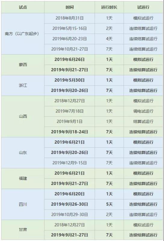 在南方(以廣東起步)試點之外,其他7個試點的結(jié)算試運行、連續(xù)結(jié)算試運行都選擇在了9月,甚至連具體時間都相差無幾。