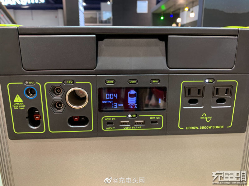 Goal Zero推出的這款移動儲能電源頂部兩側(cè)提供了手提把手,考慮到使用過程中的移動、搬運,這個把手就能派上用場。配色為黑綠色搭配,視覺上延續(xù)了Goal Zero家族的設(shè)計語言和風(fēng)格,沉穩(wěn)厚實,又有科技感。產(chǎn)品的正面設(shè)計有LCD液晶屏幕,可以直觀的查看到內(nèi)部電池組剩余電量,以及輸出接口的工作狀態(tài)等信息。