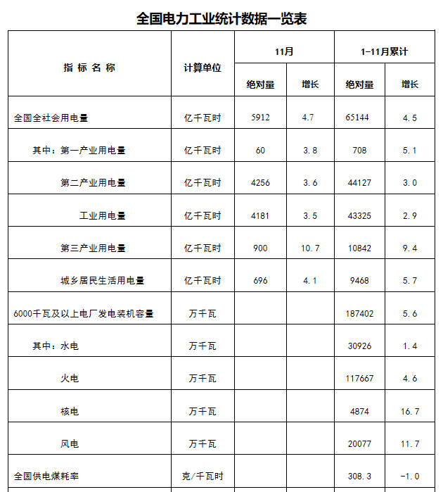 12月17日,國(guó)家能源局發(fā)布1-11月份全國(guó)電力工業(yè)統(tǒng)計(jì)數(shù)據(jù)。