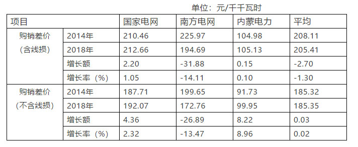 2、扣除線損,電網企業(yè)平均購銷差價2014年為185.32元/千千瓦時,2018年為185.35元/千千瓦時,增長0.02%;