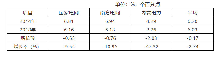 電網企業(yè)平均線損率,2014年為6.20%,2018 年為6.03%,降低了0.17個百分點,平均下降2.74%。