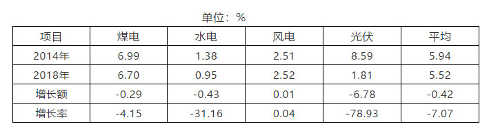 全國發(fā)電企業(yè)平均綜合廠用電率,2014年5.94%(由2015年報告中的“2015年為5.90%,同比下降0.6%”的數(shù)據反推得知),2018年為5.52%,下降7.07%。