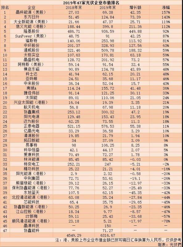 其實(shí),在資本市場(chǎng),光伏制造企業(yè)與投資企業(yè)面臨的“冰火兩重天”日益凸顯。光伏們統(tǒng)計(jì)了47家光伏企業(yè)2019年的市值變化情況,共有33家光伏企業(yè)在2019年實(shí)現(xiàn)了市值的上漲,總市值約為6317億元,相比于2018年底上漲了約1800億元。
