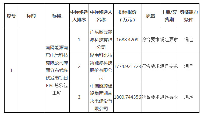 南網(wǎng)能源南京電氣科技有限公司屋面分布式光伏發(fā)電項目EPC總承包工程 (招標項目編號:0002200000063187),經(jīng)評標委員會評審,現(xiàn)將中標候選人公示如下: