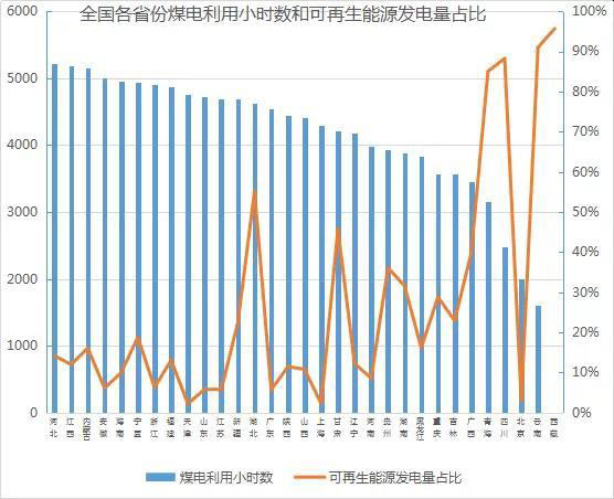 ▲圖3:各省(自治區(qū)、直轄市)煤電利用小時數(shù)和可再生能源占比排序