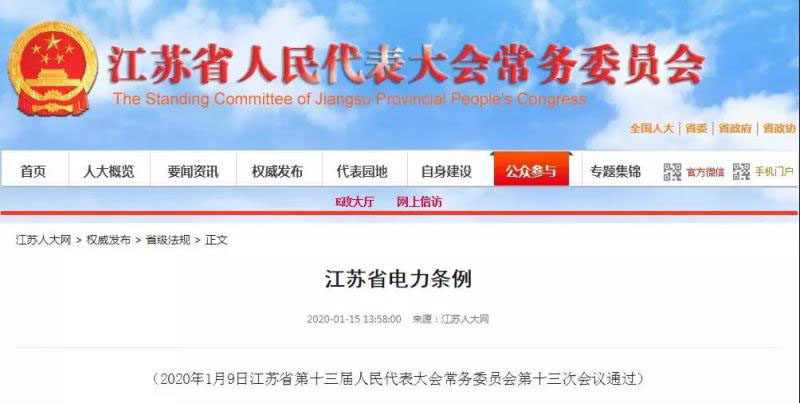 中國儲能網(wǎng)訊:1月15日,江蘇省人大常委會網(wǎng)站發(fā)布《江蘇省電力條例》,該《條例》將于5月1日施行。同時原《江蘇省電力保護條例》廢止。該《條例》指出“電力規(guī)劃應當引導智能電網(wǎng)和泛在電力物聯(lián)網(wǎng)發(fā)展”,“提高電網(wǎng)與發(fā)電側、需求側交互響應能力,構建源網(wǎng)荷儲協(xié)調發(fā)展、集成互補的能源互聯(lián)網(wǎng),促進綜合能源服務等新業(yè)態(tài)發(fā)展”;其中源網(wǎng)荷儲友好互動就指用戶自愿將儲能設施等接入電網(wǎng)實現(xiàn)與電源、電網(wǎng)互動協(xié)調,確保電網(wǎng)安全有序可靠運行。全文如下: