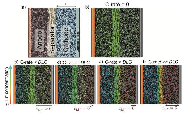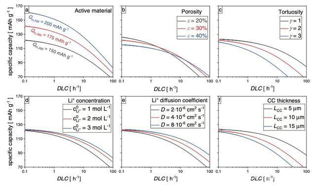 那么究竟是什么因素限制了高能量密度的電池的倍率性能呢?該因素是否能進行量化表征呢?近日,德國德累斯頓工業(yè)大學的Christian Heubner(第一作者,通訊作者)對鋰離子電池倍率性能的限制因素進行了研究,分析表明Li+的擴散是限制鋰離子電池倍率性能的主要因素,可以通過簡單的模型對擴散限制極限倍率DLC進行計算,為倍率型鋰離子電池的設計提供指導。