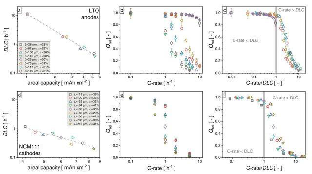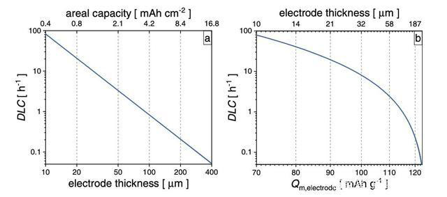 實際上作者也發(fā)現(xiàn)幾乎所有的實驗數(shù)據(jù)都表明,當電極的倍率超過了DLC后其容量發(fā)揮都會顯著的降低,因此盡管DLC的定義比較簡單,但是卻能夠很好的預測電極的倍率性能。當然在實際電極設計中還存在尚未達到DLC,電極的容量發(fā)揮就出現(xiàn)顯著降低的現(xiàn)象,這主要是電極在設計中未充分考慮電荷交換、歐姆阻抗和Li+遷移數(shù)等其他限制因素。