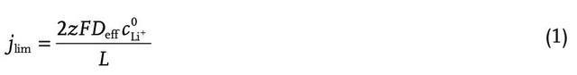 電池的擴散限制極限電流Jlim可以通過菲克定律和法拉第定律計算得到(如下式所示),在下式中z為Li+電荷數(shù),F(xiàn)為法拉第常數(shù),CoLi+為初始Li+濃度,L為電極的厚度,Deff為電極的有效擴散系數(shù)。