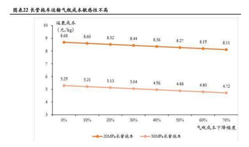 而隨著技術(shù)的發(fā)展,將來(lái)運(yùn)輸氣瓶的成本會(huì)出現(xiàn)一定程度的下降,長(zhǎng)管拖車(chē)灌充氫氣的時(shí)間的下降, 也能使長(zhǎng)管拖車(chē)式運(yùn)氫成本降低,但是下降幅度有限。下圖為假定加氫站規(guī)模為500kg/d,運(yùn)輸距離為100km 時(shí),運(yùn)輸成本隨氣瓶成本的變動(dòng)的情況。而在氣瓶成本下降的同時(shí),人工成本的上升也會(huì)中和掉科技發(fā)展 帶來(lái)的技術(shù)紅利,故長(zhǎng)管拖車(chē)的運(yùn)氫成本下降幅度有限。