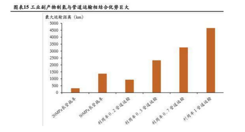 而若在 50MPa 的運(yùn)輸壓強(qiáng)下,工業(yè)副產(chǎn)物制氫的總成本在運(yùn)輸距離為 500km 時(shí)僅為 22.01 元/kg,而 煤氣化制氫的總成本也能基本控制在 32 元/kg 左右,天然氣制氫總成本大概在 40 元/kg 左右,未來(lái)隨著制 氫工藝的改進(jìn),有望踏入 30 元/kg 的大關(guān)。