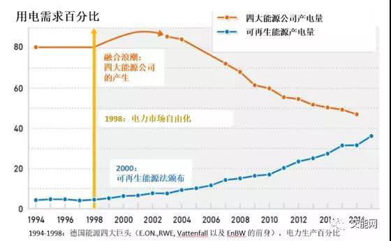 1998是德國電力市場改革的元年,在此之后,雖然供應商的種類有所增加,終端用戶擁有了自主選擇權,但本國四大發(fā)電集團(RWE,E.ON,Vattenfall和EnBW)仍然占據(jù)著德國發(fā)電量的近50%。2000年通過的《可再生能源法》(EEG)在促進可再生能源方面發(fā)揮著核心作用,不僅允許市政公用事業(yè)、中型公司和個人能源系統(tǒng)進入電力市場,讓電力生產(chǎn)進一步充分競爭,優(yōu)勝劣汰,也可確保投資安全,使相關的貸款發(fā)放更為容易。