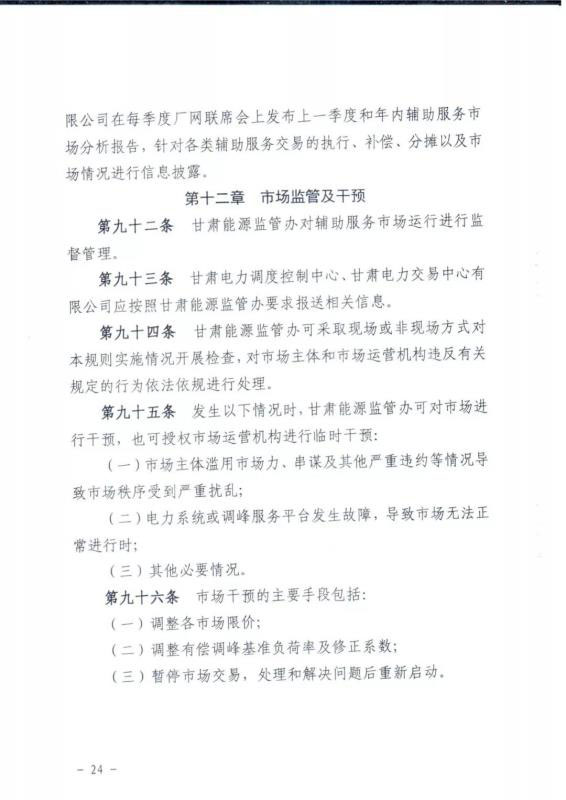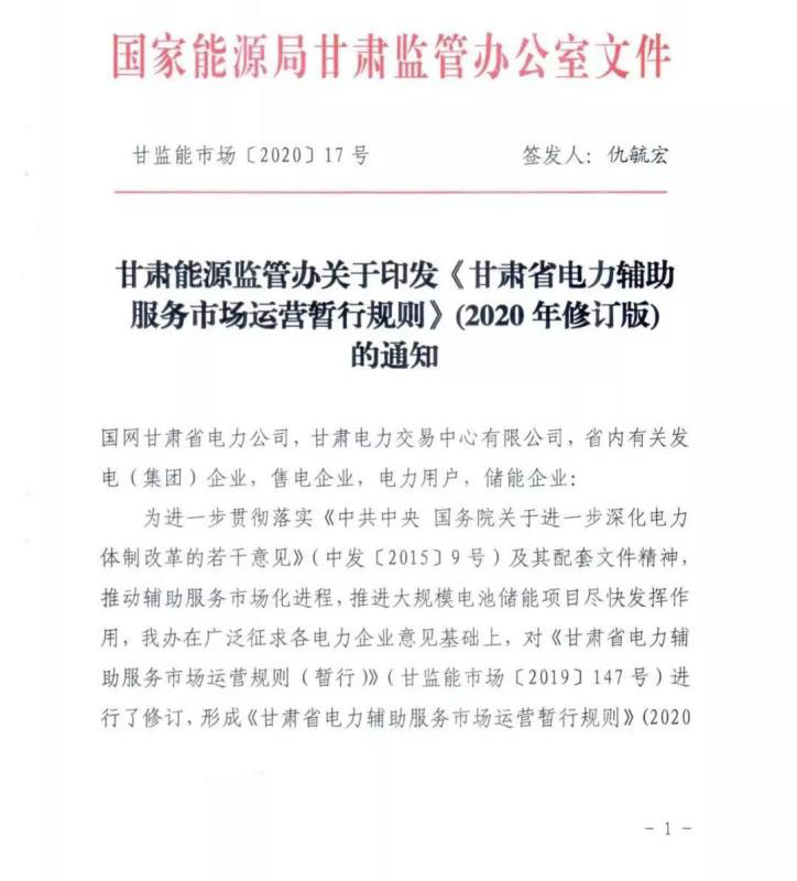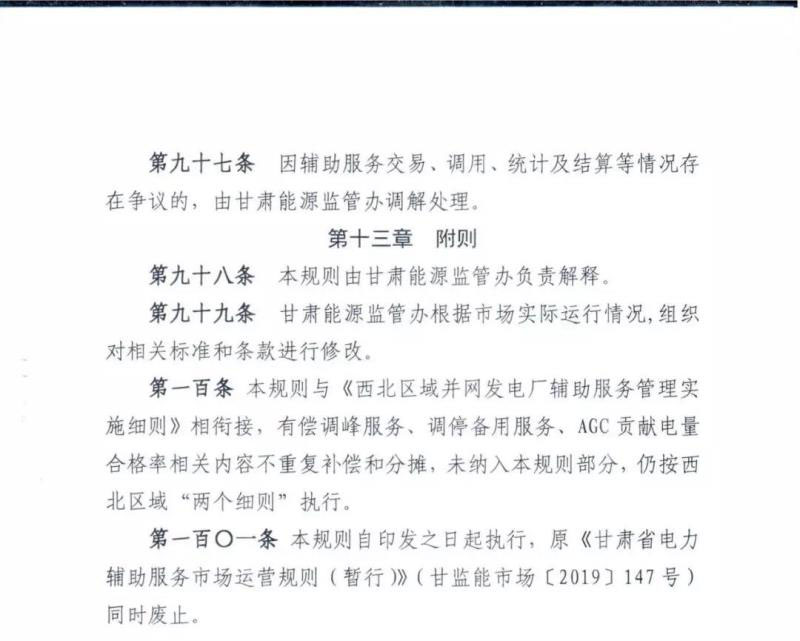 甘肅能監(jiān)辦為進(jìn)一步推動(dòng)輔助服務(wù)市場(chǎng)化進(jìn)程,推進(jìn)大規(guī)模電池儲(chǔ)能項(xiàng)目盡快發(fā)揮作用,現(xiàn)對(duì)《甘肅省電力輔助服務(wù)市場(chǎng)運(yùn)行規(guī)則(暫行)》進(jìn)行修訂,形成《甘肅省電力輔助服務(wù)市場(chǎng)運(yùn)營(yíng)暫行規(guī)則》(2020年修訂版)。