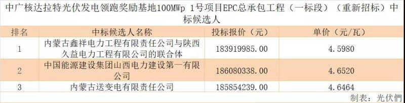 2月3日,中廣核達拉特光伏發(fā)電領跑獎勵基地100MWp 1號項目EPC總承包工程(一標段)(重新招標)中標候選人公示。內蒙古鑫祥電力工程有限責任公司與陜西久益電力工程有限公司的聯(lián)合體以183919985元的總報價,單價4.589元/瓦的報價位列第一中標候選人。