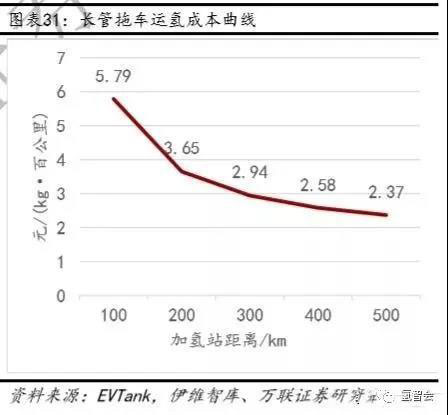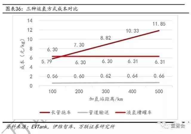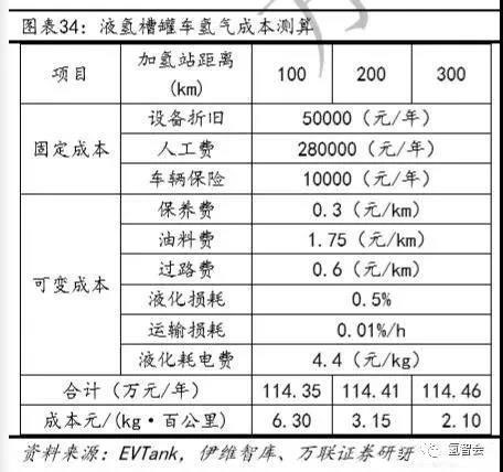 液氫運(yùn)輸?shù)某杀窘Y(jié)構(gòu)與長(zhǎng)管拖車較為類似,但液化成本較高且運(yùn)輸過程中損耗較大。我們假設(shè)運(yùn)輸過程中每小時(shí)損耗0.01%,液化過程中損耗0.5%,耗電10kWh/kg,液氫裝卸需0.5小時(shí)。液氫槽罐車價(jià)格約50萬元/輛,10年折舊,載氫量為4000kg;液氫運(yùn)輸百公里成本為6.30元/kg,500公里成本可降低至1.26元/kg。