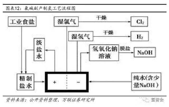 工業(yè)副產(chǎn)氫的方式主要有氯堿副產(chǎn)氫、焦?fàn)t煤氣制氫和輕烴裂解制氫。其中氯堿工業(yè)生產(chǎn)以食鹽水為原料,利用隔膜法或離子交換膜法兩種工藝,生產(chǎn)包括燒堿、聚氯乙烯(PVC)、氯氣和氫氣等產(chǎn)品。國(guó)內(nèi)氯堿行業(yè)基本上全部采用離子膜電解路線,一氧化碳含量較低且無化石燃料中的有機(jī)硫和無機(jī)硫,因此是燃料電池氫源的較優(yōu)選擇。氯堿副產(chǎn)制氫具有氫氣提純難度小、耗能低、自動(dòng)化程度高以及無污染的特點(diǎn),氫在提純前純度已高達(dá)99%以上。