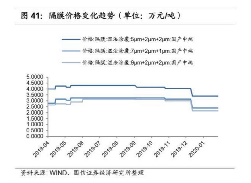 目前國內(nèi)隔膜行業(yè)已進入淡季,出貨普遍不高。隔膜市場混亂,價格戰(zhàn)現(xiàn)象較 為嚴(yán)重,待行業(yè)整合結(jié)束,預(yù)計明年隔膜價格可能會回歸理性。本周隔膜價格 穩(wěn)定,其中 5μm 濕法基膜報價 2.5-3.3 元/平方米;5μm+2μm+2μm 濕法涂覆隔 膜報價為 3-3.8 元/平方米;7um 濕法基膜報價為 1.8-2.2 元/平方米; 7μm+2μm+2μm 濕法涂覆隔膜報價為 2.2-2.6 元/平方米。動力價格方面:14μm 干法基膜報價為 1-1.1 元/平方米;9um 濕法基膜報價 1.3-1.7 元/平方米; 9μm+2μm+2μm 濕法涂覆隔膜報價為 1.8-2.5 元/平方米。